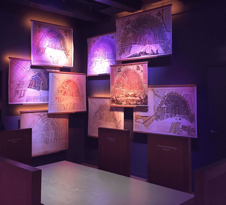 In one of the rooms, dramatic lights illuminated lots of city maps that were casually hanging in an overlapping manner on the walls, surrounding a wooden table and its six heavy chairs. In each chair, I could read in the second line (the first was in Dutch, of course) the name of an eminent position, such as Mayor or Chief Engineer. Before I could finish reading all the chair labels, the audio-guide started playing what I could quickly identify was a person starting a conversation, rather than the usual monotonic explanation. At the same moment, one of the chairs lit up to indicate that the person speaking was the Mayor. The representation of what I learned was an important meeting continued with chairs lighting up one-by-one as different people would speak. While discussing how to address the issues Amsterdam was facing when the canals were being planned, sketches and maps mentioned by the characters would be instantaneously projected onto the centre of the table.