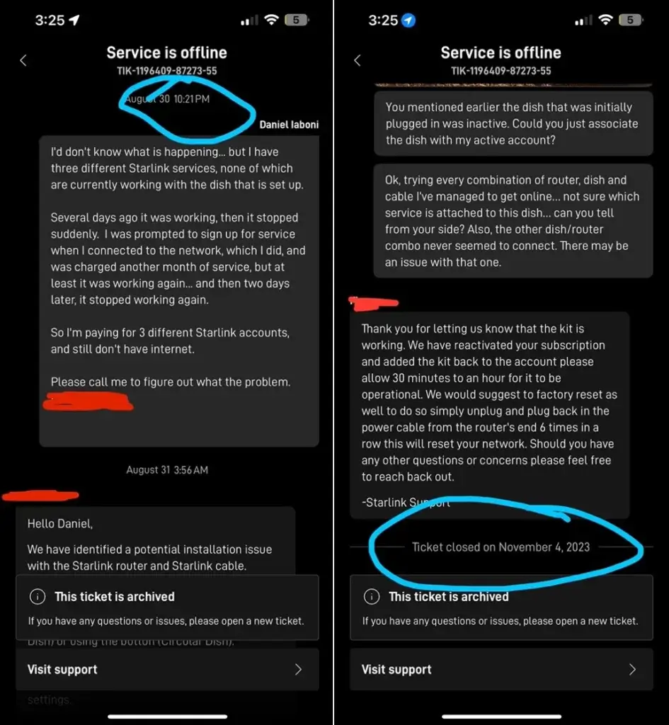 What followed was a month-long ordeal. I had to make regular trips to the nearest public wifi spot, a 20-minute drive from my home, to check if the Starlink representative responded. If they did, it often required additional information or photos, which I had to go back home to collect and then wait until my next trip out to respond. What could have been a quick conversation with a support agent turned into 10-15 minutes of typing on my phone.
